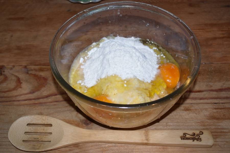 Добавьте соль, перец, куриные яйца, муку и мелко нарезанное (или измельченное при помощи мясорубки или блендера) куриное мясо. Замесите тесто.