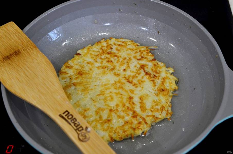 7. В сковороде разогрейте масло, выложите картофельную массу, обжарьте с одной стороны, затем переверните.