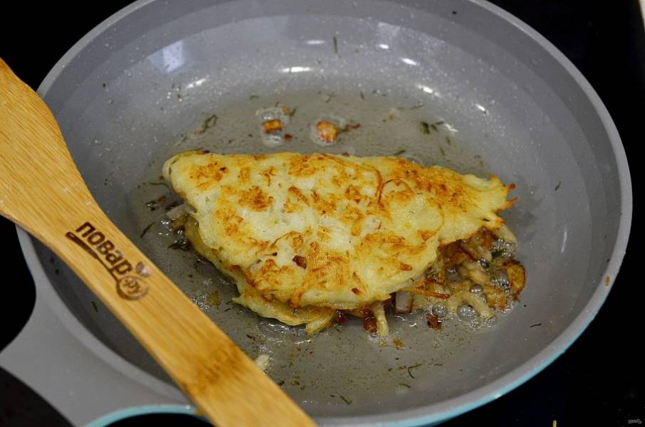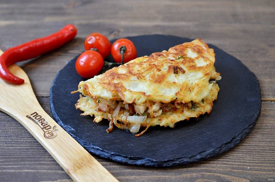 8. Выложите на половину драника начинку и накройте второй половинкой. Обжарьте с двух сторон.