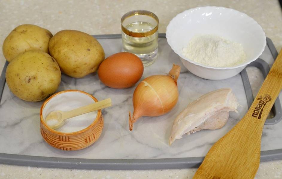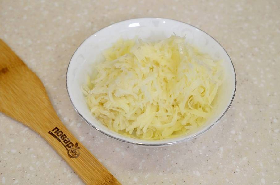 5. Картофель почистите, натрите на терке, посолите и отожмите от жидкости.