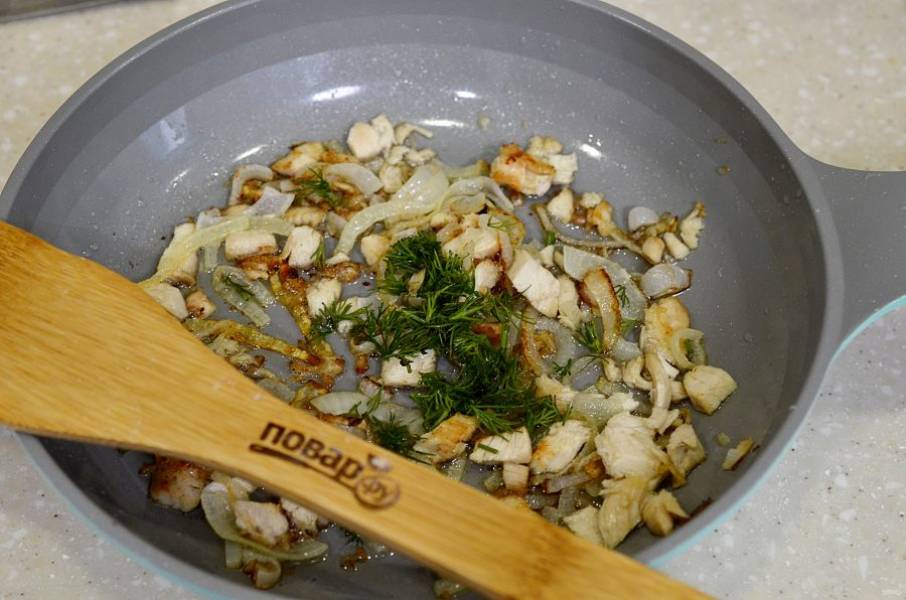 4. Посолите, добавьте зелень, перемешайте. Начинка готова.