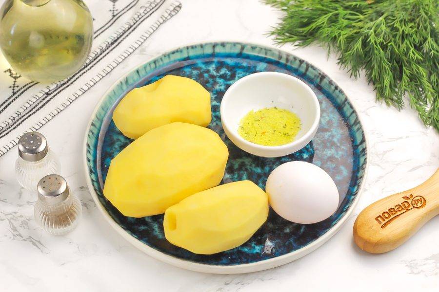 Подготовьте указанные продукты. Картофель приобретайте желтый или розовый — он отлично пропекается и не остается жестким. Очистите корнеплоды от кожуры и промойте в воде.