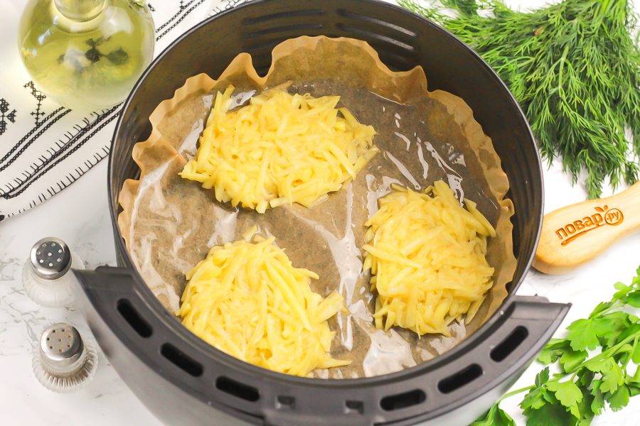 Застелите поддон аэрогриля пергаментной бумагой и смажьте ее растительным маслом. Выложите части натертого картофеля и прижмите их, чтобы они были одинаковыми по толщине.