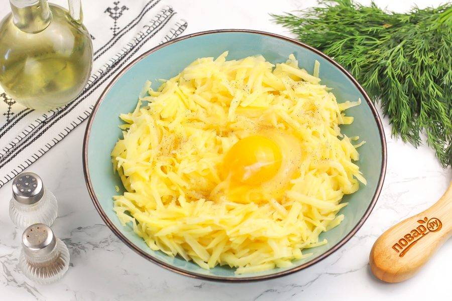 Картофель натрите в глубокую емкость: миску или салатник на терке с крупными ячейками. Оставьте массу на 5-6 минут и затем отожмите образовавшийся сок.