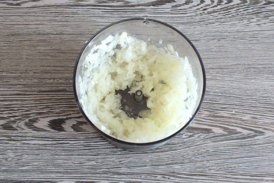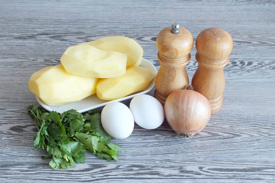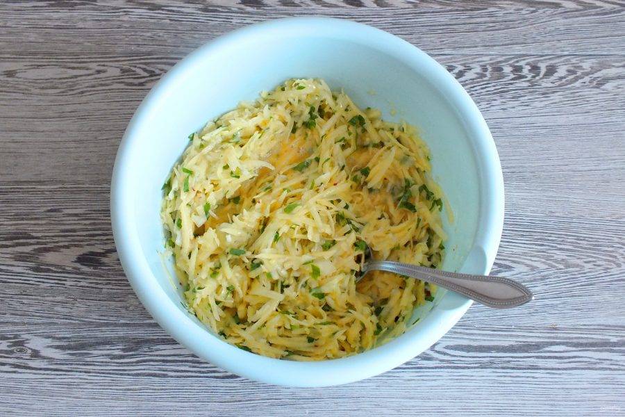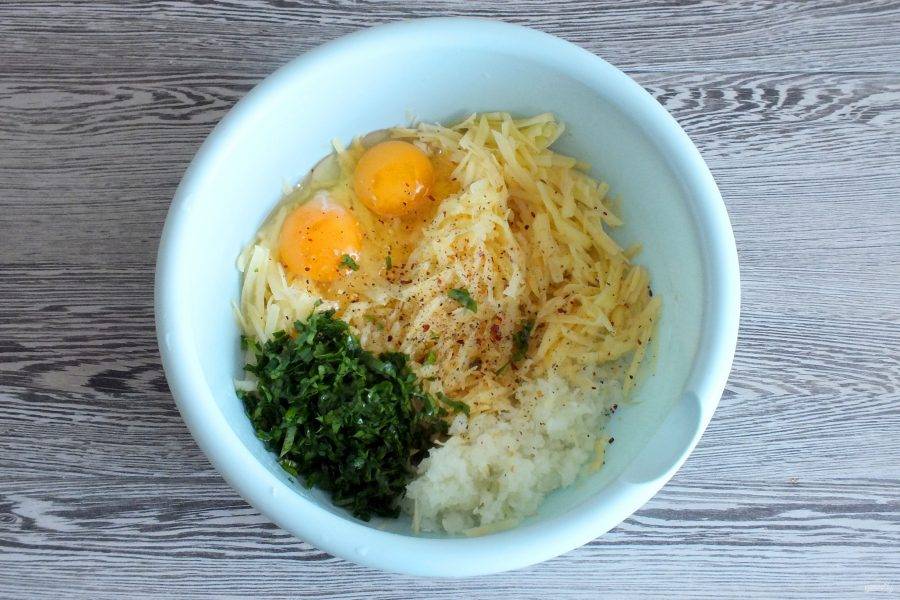 Натрите на крупной терке картофель. Слегка отожмите. Выложите в чашу. Добавьте к нему яйца, соль, перец, измельченные лук и зелень.