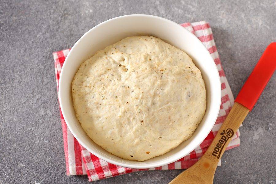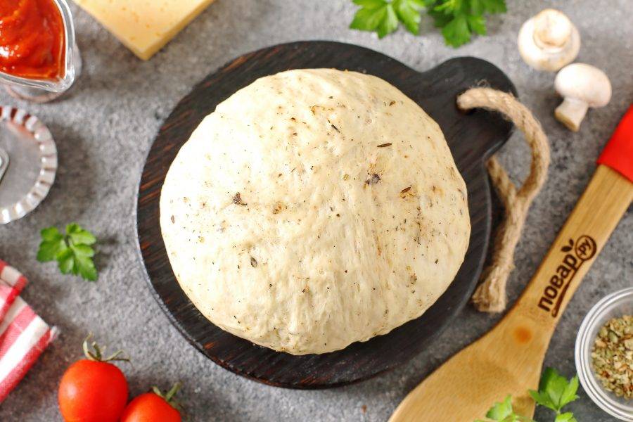Готовое тесто должно увеличиться примерно в 2 раза. Дрожжевое тесто для пиццы с травами готово. Остается тесто раскатать, смазать соусом и дополнить начинкой.