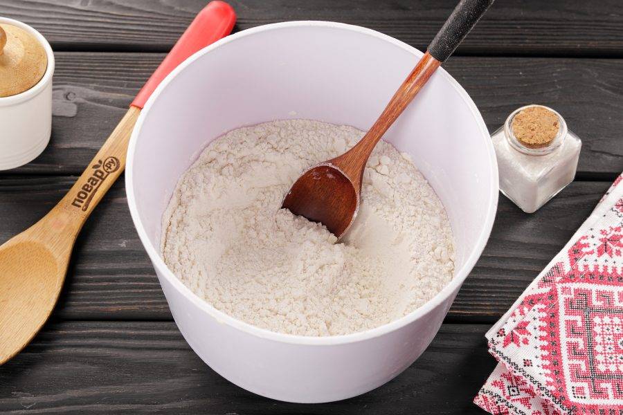 В глубокой миске соедините 300 грамм муки, сахар, соль и дрожжи. Если планируете готовить сладкую выпечку, то добавьте ещё 1 ст.л. сахара и ванилин.