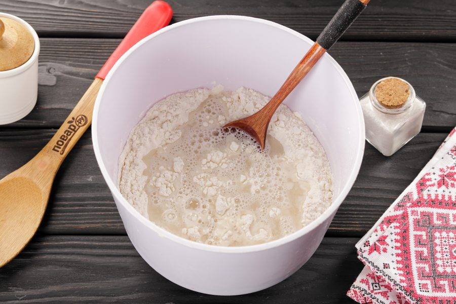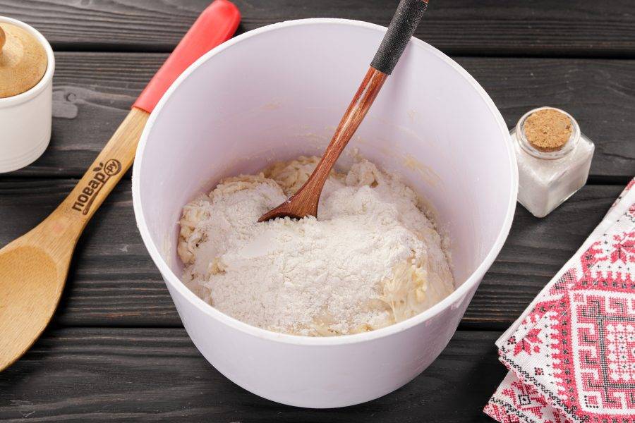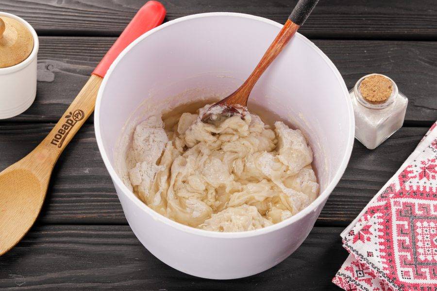 Затем частями добавьте оставшуюся муку и когда станет трудно перемешивать, продолжите замес руками на столе.