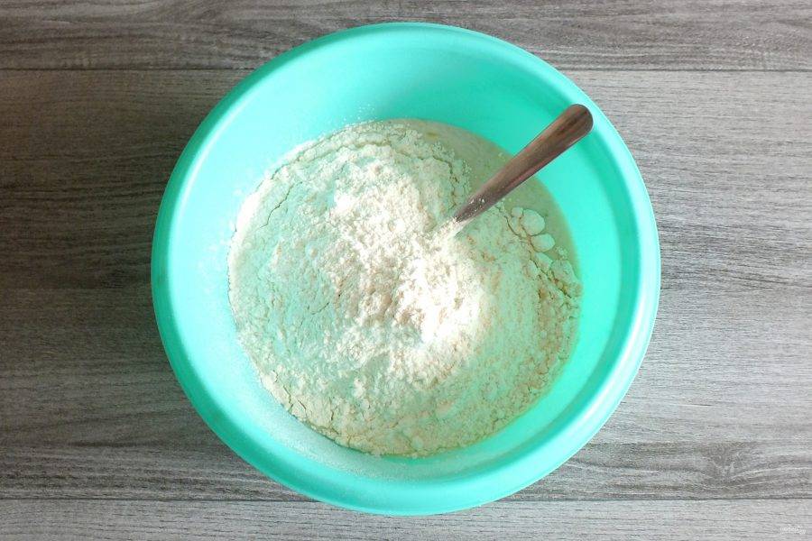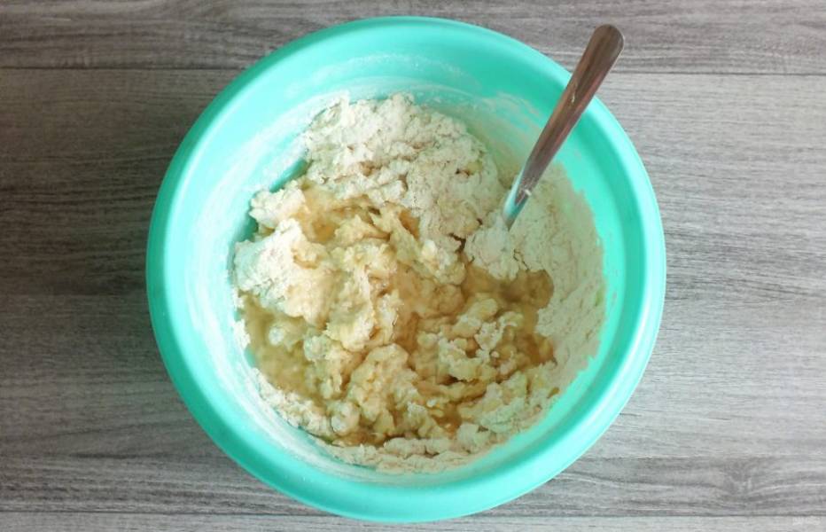 Добавьте в чашу опару, муку. Начните перемешивать вилкой.