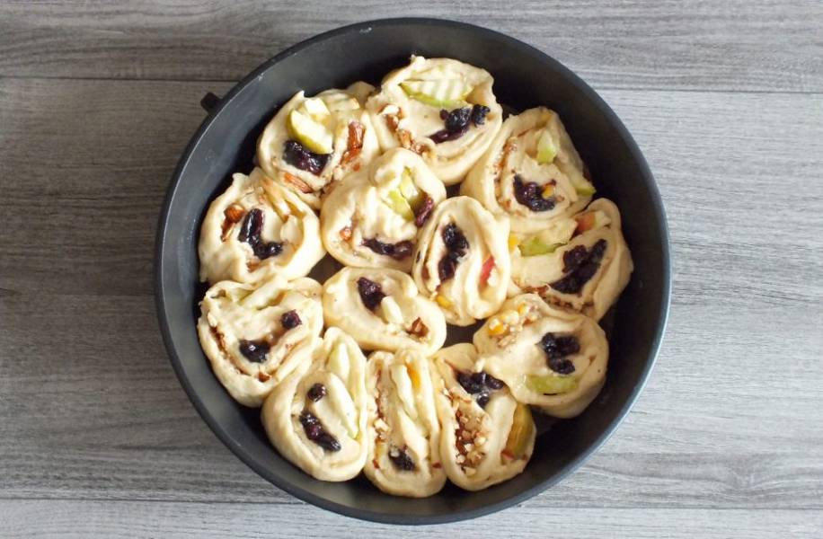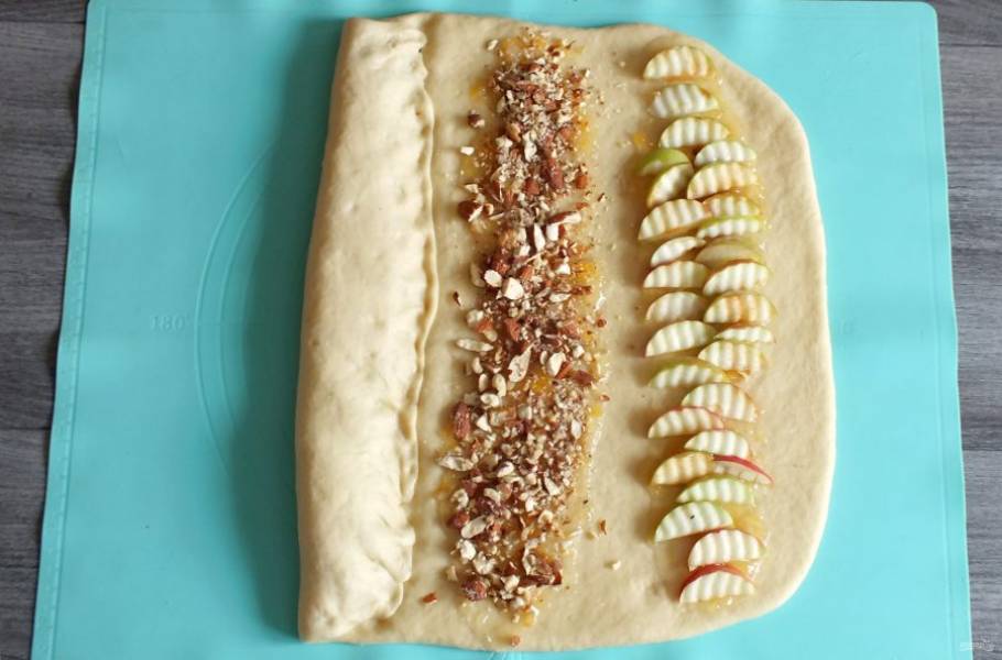 Прикрытой частью с изюмом накройте полосу с орехами. Полосу с яблоками, прикройте сводным краем пласта.