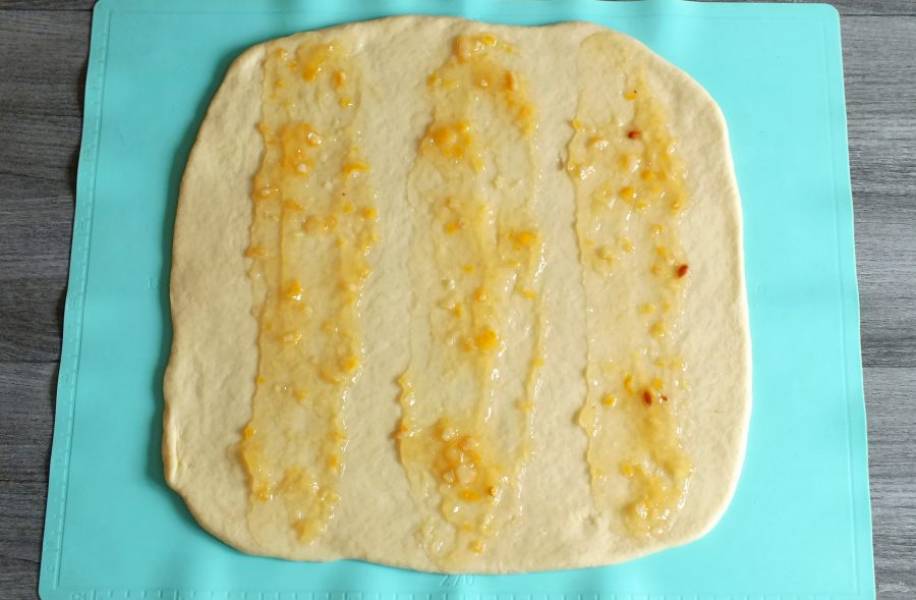 Отступив от края пласта нанесите полосу лимонного варенья. Отступив еще дважды, сделайте еще две полосы.