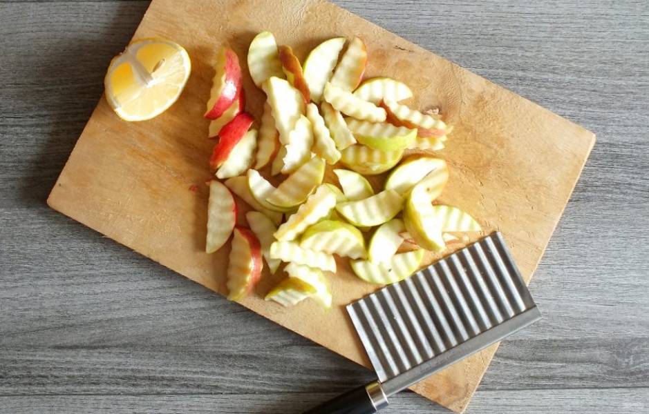 У яблок удалите семенную коробочку. Нарежьте на ломтики. Сбрызните лимонным соком.