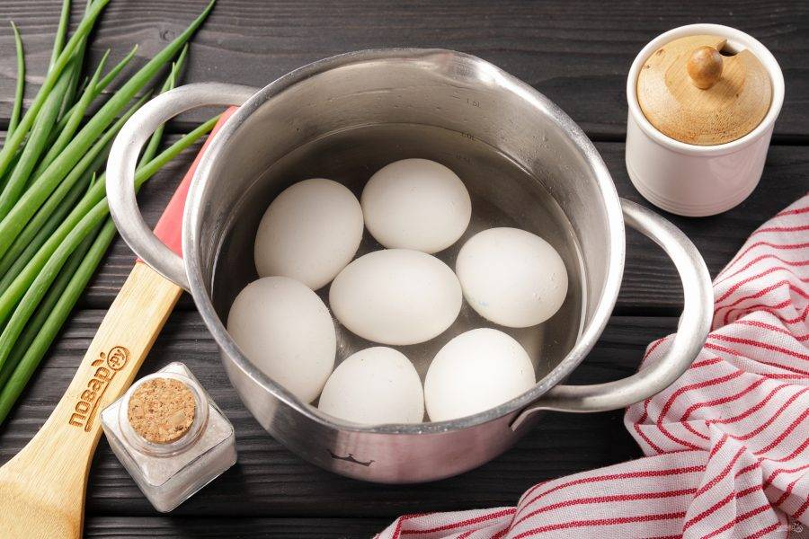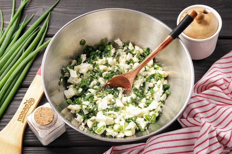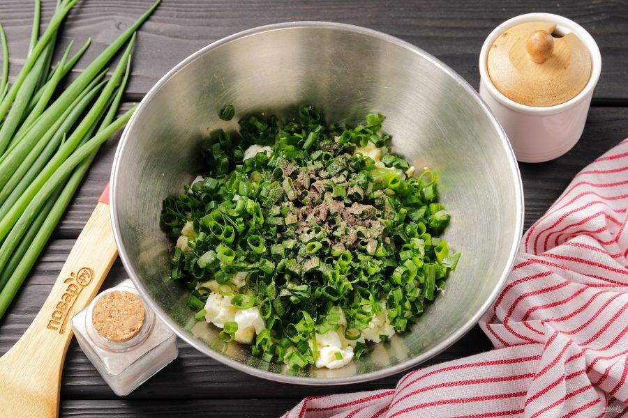 Сваренные вкрутую яйца остудите, а затем очистите и нарежьте кубиком. Добавьте мелко рубленный зелёный лук, соль и молотый перец по вкусу.
