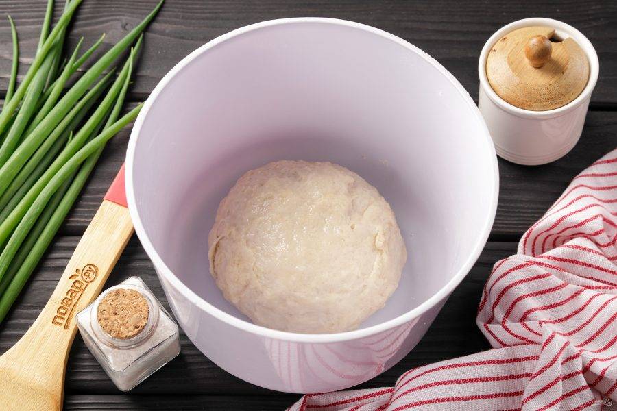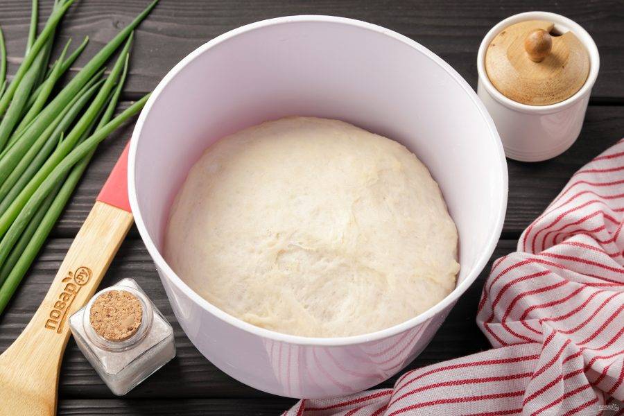 Замесите мягкое и чуть липкое тесто. Смажьте руки растительным маслом, соберите тесто в шар, накройте миску полотенцем и поставьте в тёплое место для подъёма на 1-1,5 часа.