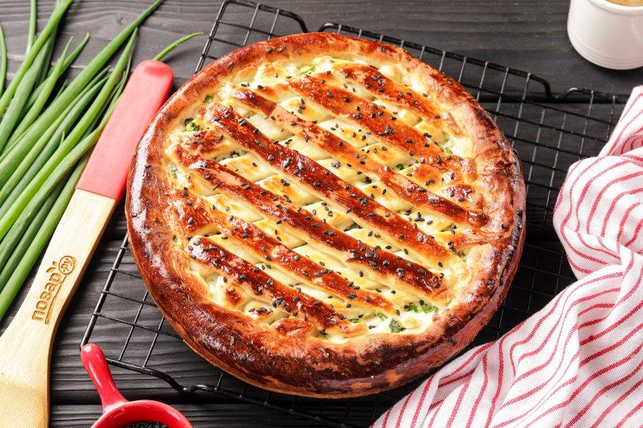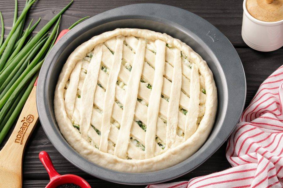 Оставшийся пласт теста раскатайте тонко в форме прямоугольника, нарежьте полосками и с помощью их украсьте пирог. Края пирога немного подогните к центру.