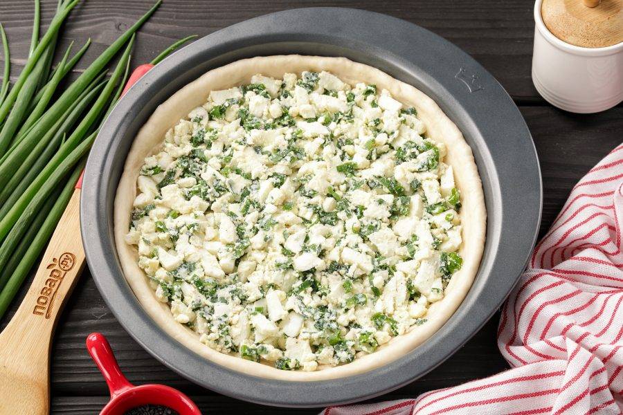 Выложите тесто в смазанную маслом форму и сформируйте руками высокие бортики. Сверху распределите начинку.
