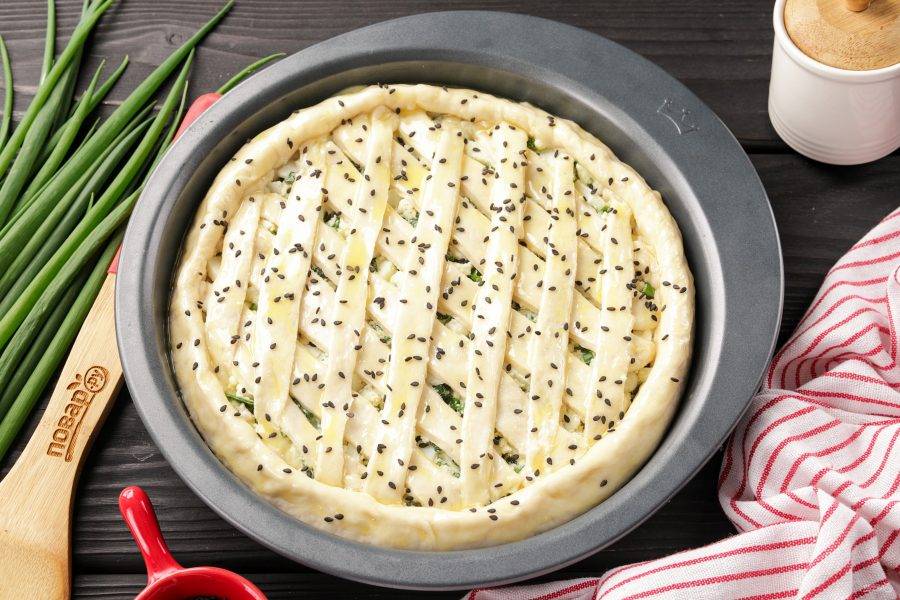 Смажьте тесто желтком и посыпьте кунжутом. Выпекайте в заранее разогретой до 190 градусов духовке около 25-30 минут.