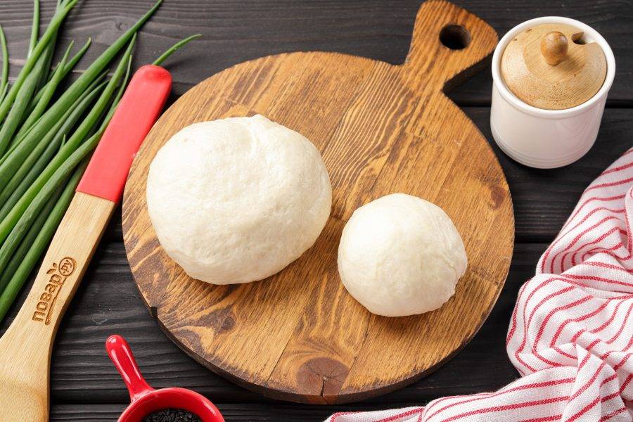 Как тесто подойдёт, его необходимо хорошо обмять и разделить на две неравные части.