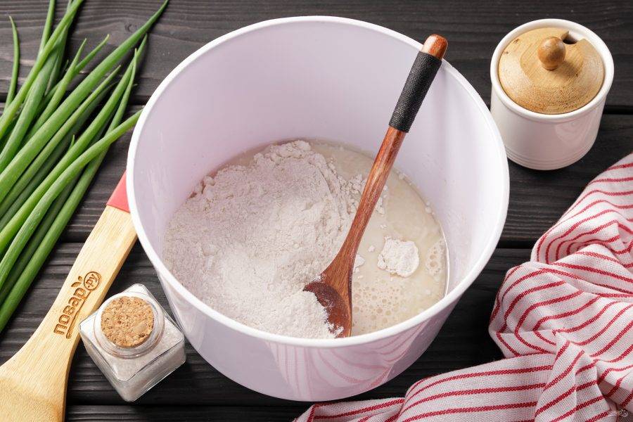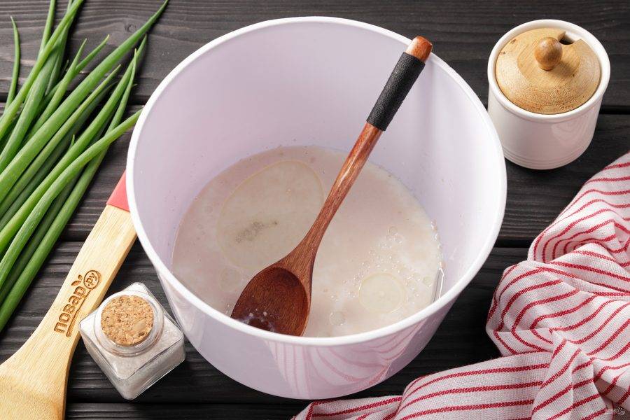 Соедините тёплое молоко, сахар и дрожжи. Оставьте на 10 минут, затем добавьте соль и масло.