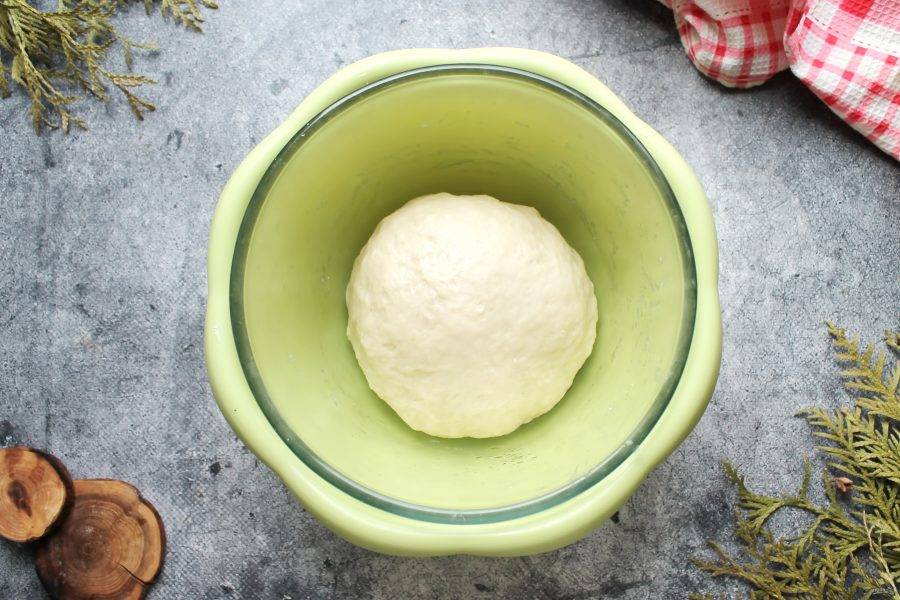 Замесите мягкое, не липкое тесто. Вымешивайте тесто не менее 10 минут, сформируйте в шар и выложите в глубокую миску, смазанную растительным маслом.