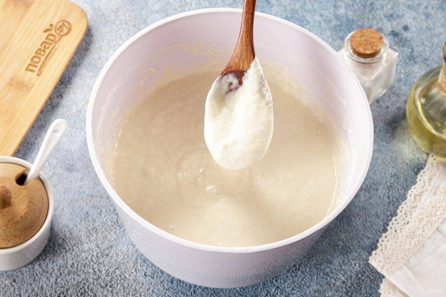Муки может уйти чуть больше или меньше, чем указано в рецепте. Готовое тесто должно получиться достаточно вязкое и лениво стекать с ложки.