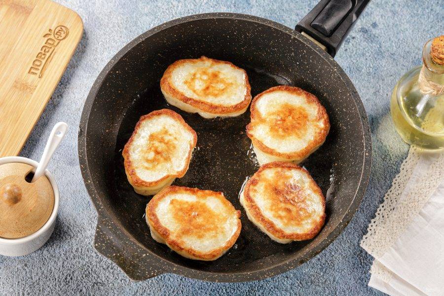 Жарьте их на среднем огне до румяности, затем переверните на другую сторону. Готовые оладьи переложите сначала на бумажное полотенце, чтобы убрать излишки масла, а потом переложите на тарелку.