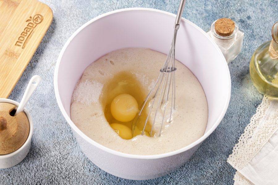 Всыпьте оставшийся сахар и всю соль. Вбейте яйца.