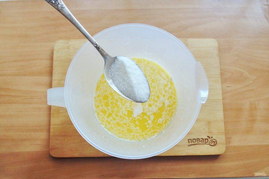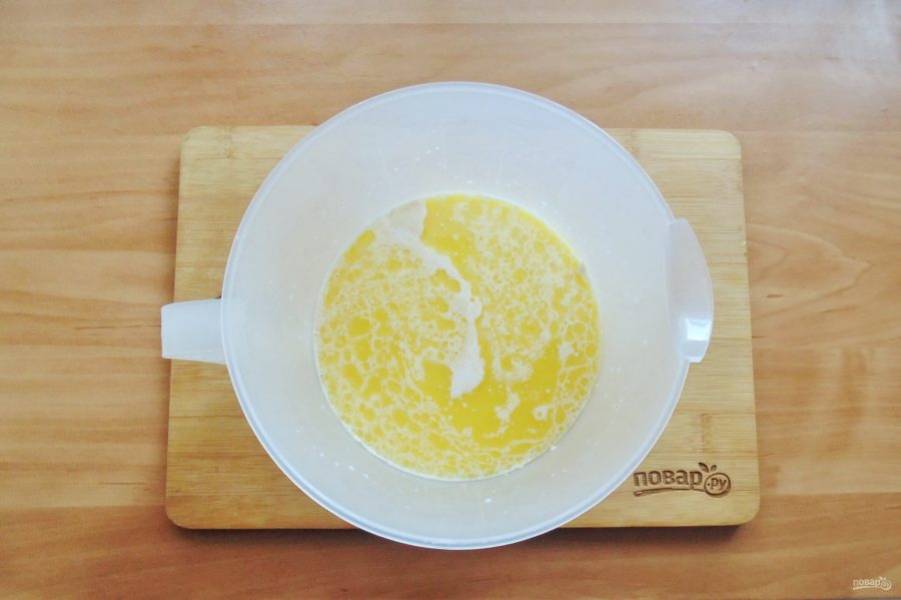 Добавьте тёплое молоко, растопленное и слегка охлаждённое масло и ложку сахара. Пусть дрожжи активируются.