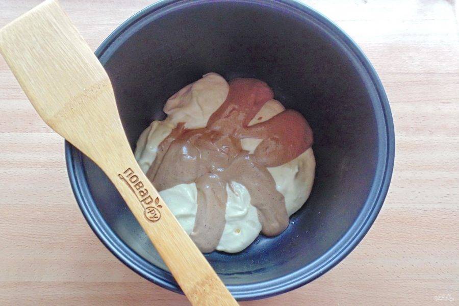 Чашу мультиварки или форму для выпечки смажьте небольшим количеством масла. Выложите поочередно светлое тесто и коричневое.