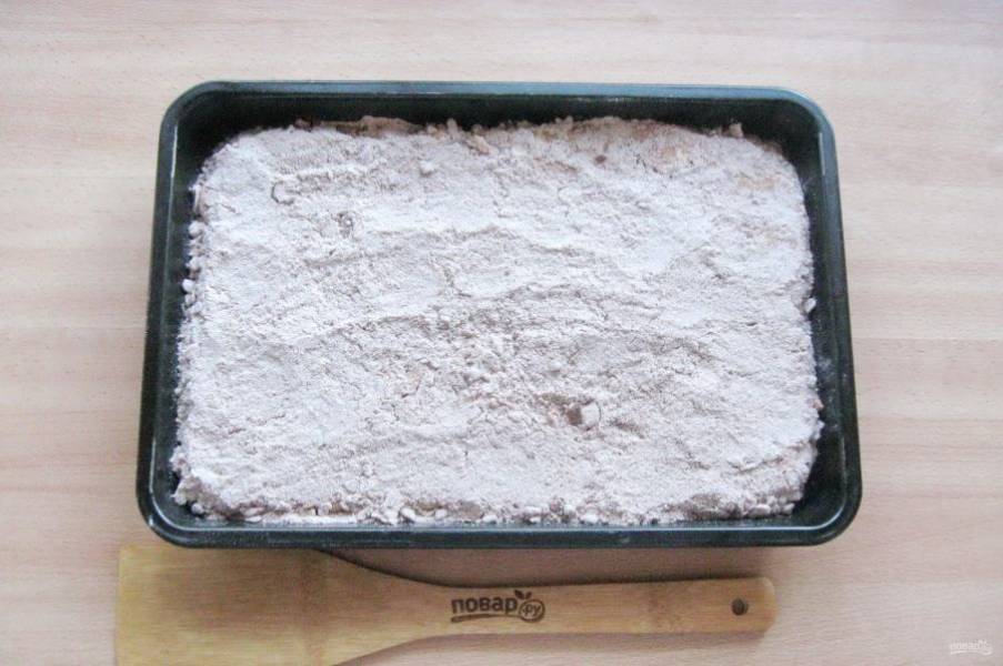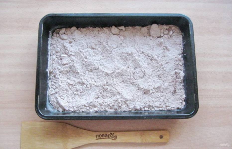Разделите крошку на три части, а творожную массу на две части. В форму для выпечки выложите третью часть крошки. Размеры моей формы — 20х30 сантиметров.