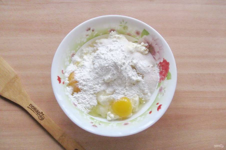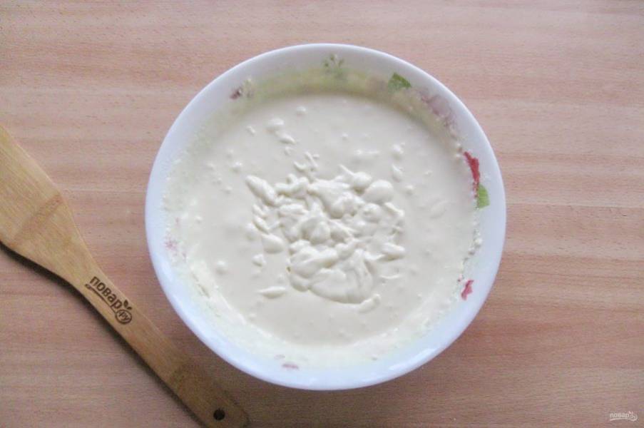 Перемешайте творог, сметану, сахар, яйца и крахмал. Взбейте блендером или миксером до однородной, кремовой консистенции.