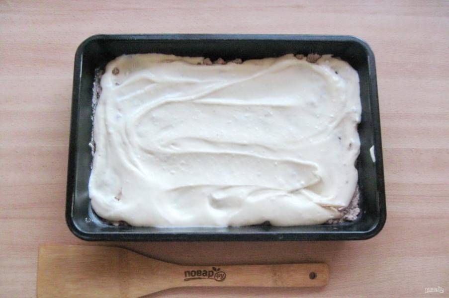 Затем насыпьте еще третью часть крошки. И на неё выложите вторую половину творожной массы. Накройте третьей частью крошки.