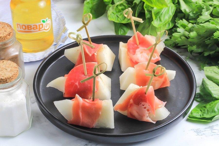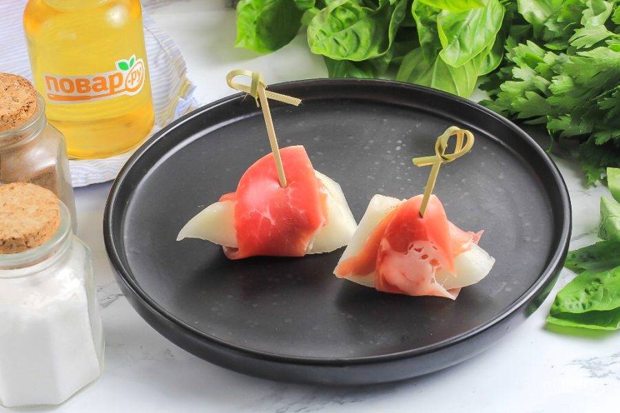 Далее разрежьте пласты прошутто пополам по высоте и обверните каждым из них кусочек дыни. Закрепите мясо на дыне с помощью шпажки.