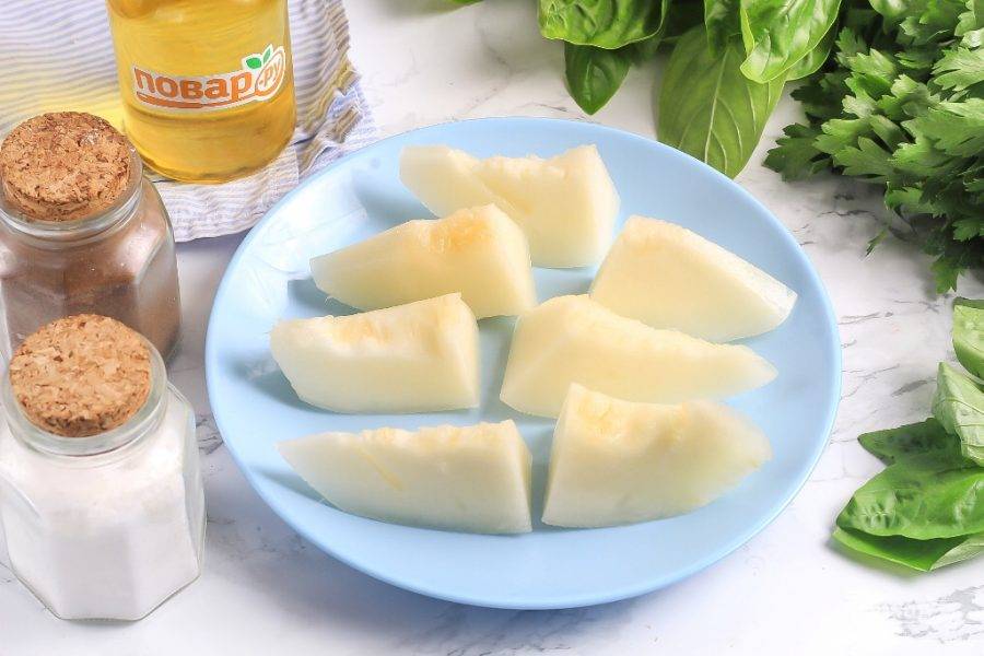 Разрежьте дыню на дольки, а их — пополам, чтобы у вас получились крупные брусочки. Выложите их на тарелку или блюдо.
