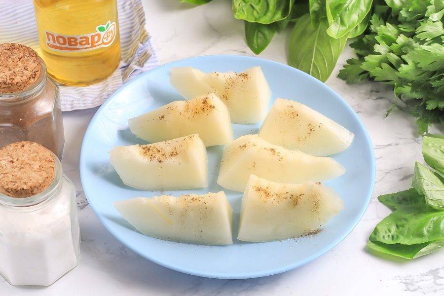 Присолите и поперчите кусочки дыни. Таким образом у вас получится уже набор вкусов: сладкий, соленый и горький.