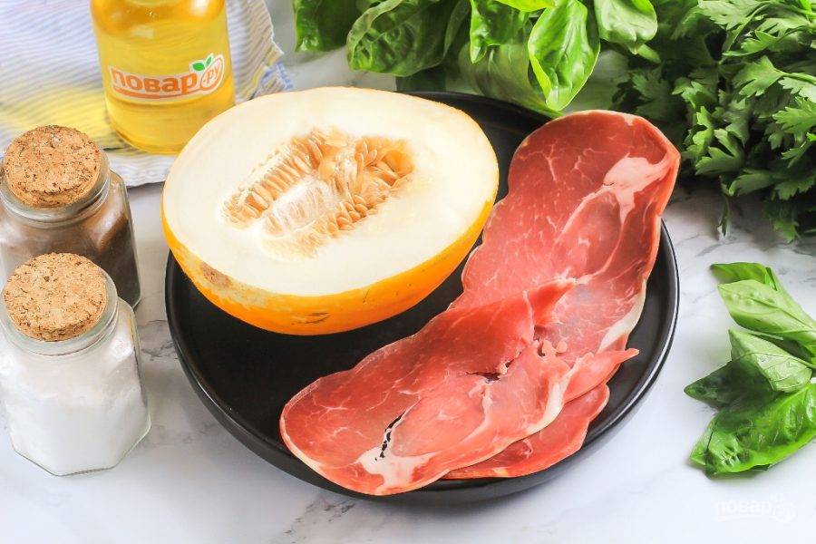 Подготовьте указанные продукты. Дыню заранее разрежьте и удалите косточки.
