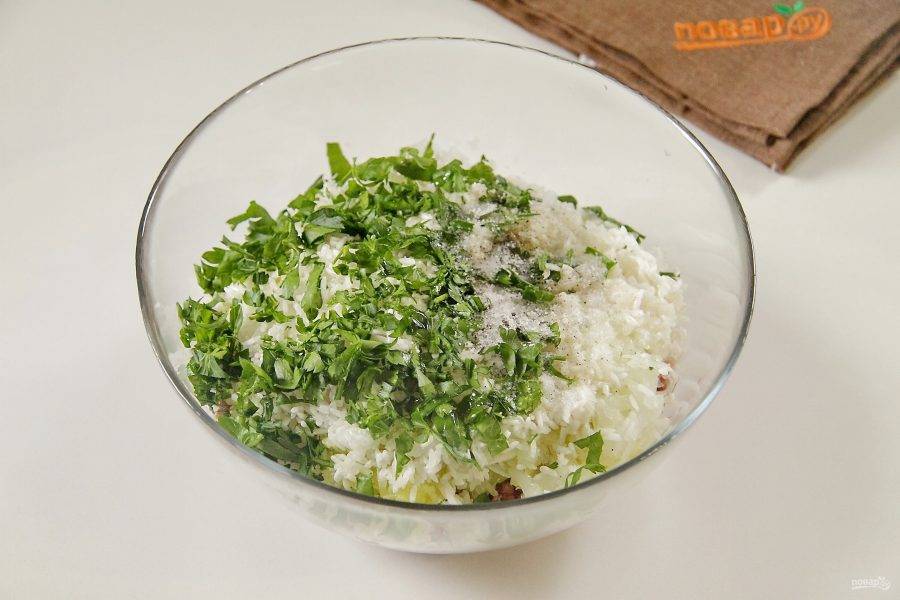 В воде разведите крахмал и влейте к фаршу. Добавьте промытый рис, любую свежую измельченную зелень, масло, соль и специи по вкусу.