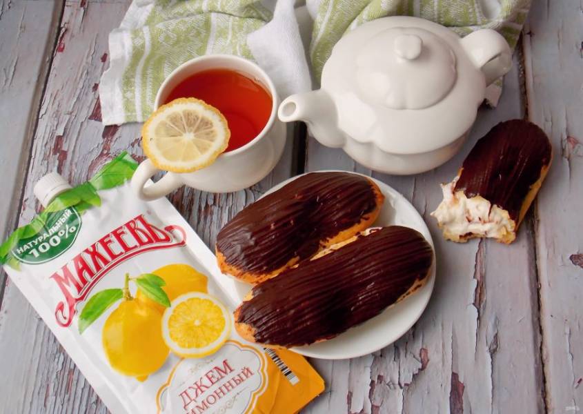 Вкусные, тающие во рту эклеры, с воздушным кремом и легким лимонным ароматом, который придает лимонный джем "Махеевъ". Это очень вкусно и просто!