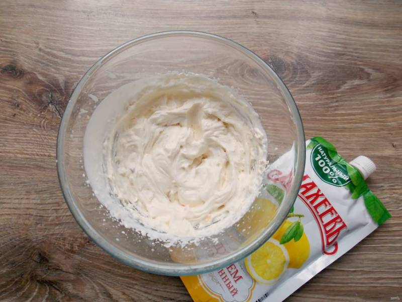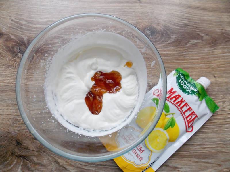 Влейте сливки с миску и взбейте до плотности. Добавьте лимонный джем" Махеевъ".
