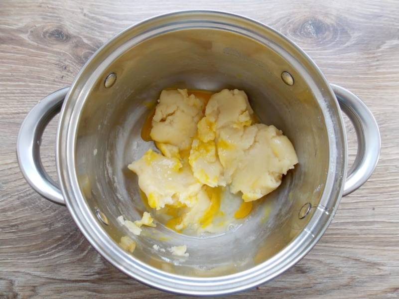 Перемешивайте тесто до остывания. Затем вводите яйца по одному, каждый раз, хорошенько вымешивая до однородности.