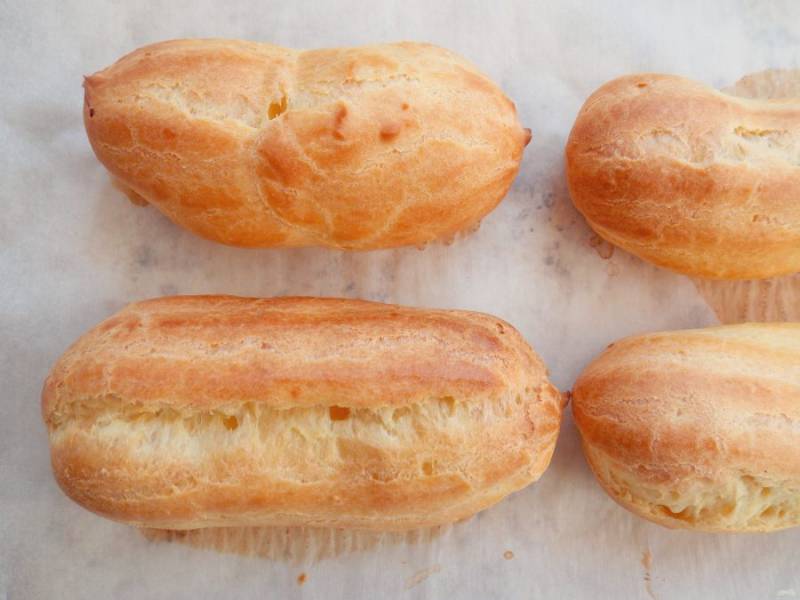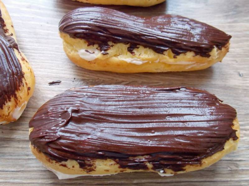 Эклеры разрежьте с одного бока и начините кремом. Смажьте верх растопленным шоколадом и уберите в холодильник до застывания шоколада.