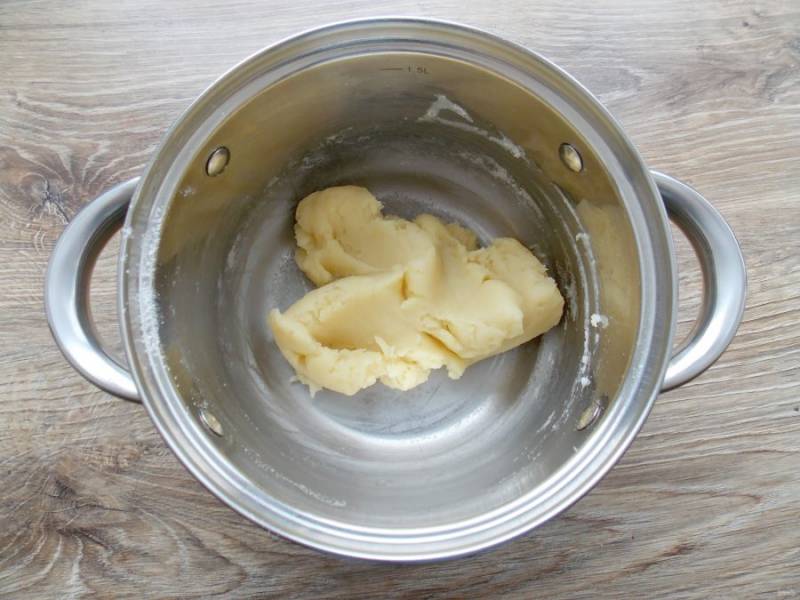 В кипящую жидкость при перемешивании, всыпьте просеянную муку. Варите еще 1-2 минуты пока тесто не соберется в ком и не начнет отходить от стенок кастрюли.
