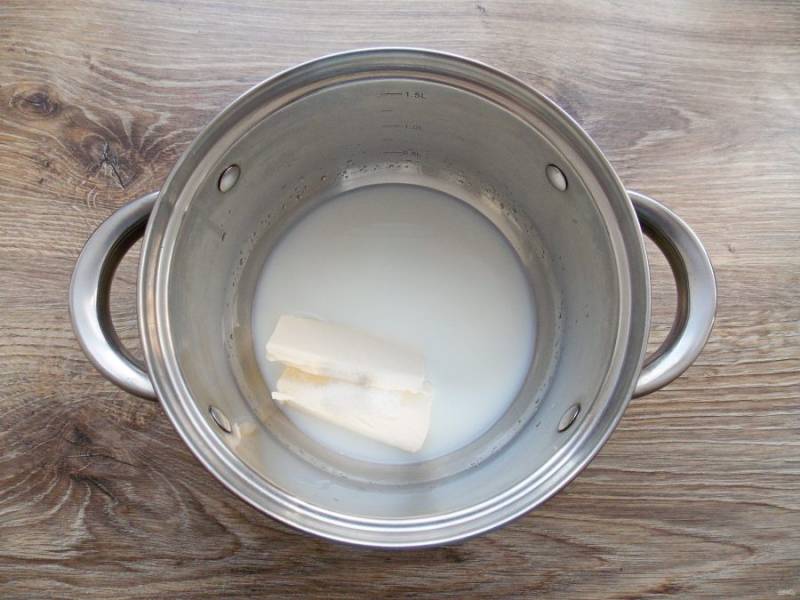 В кастрюлю положите масло, сахар, соль и влейте молоко с водой. Поставьте на средний огонь и доведите до кипения.