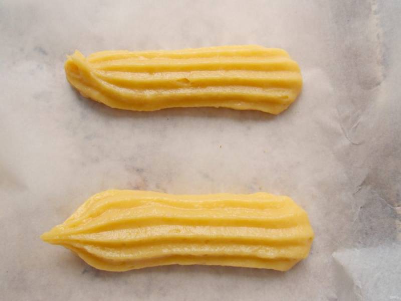 Положите тесто в корнетик и отсадите полоски теста, примерно 11 сантиметров на противень с бумагой для выпечки.
