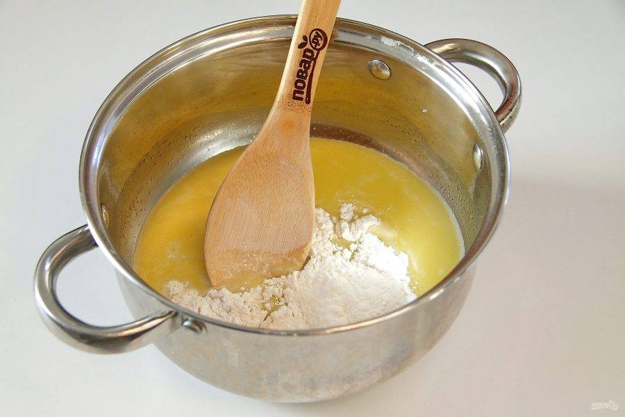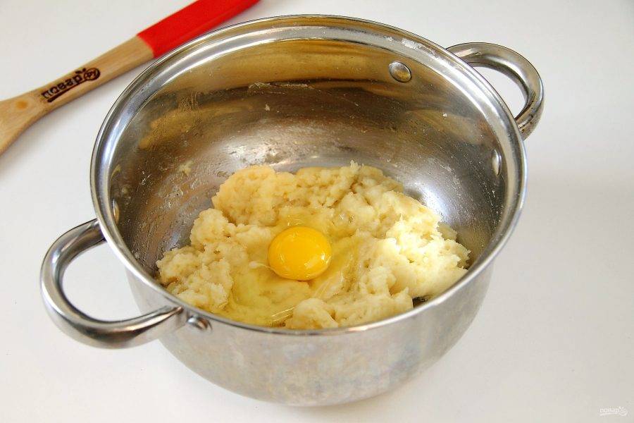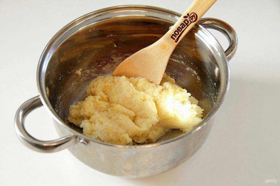 5. Дайте тесту немного остыть, после чего введите по одному яйца, каждый раз перемешивая тесто ложкой или лопаткой. Сначала по одному введите два штуки. Третье яйцо взбейте в отдельной миске и по одной столовой ложке добавьте к тесту. Если понадобится, таким же образом введите еще одно яйцо. В зависимости от сорта яиц, может уйти как 2,5, так и 3 или 4 штуки.