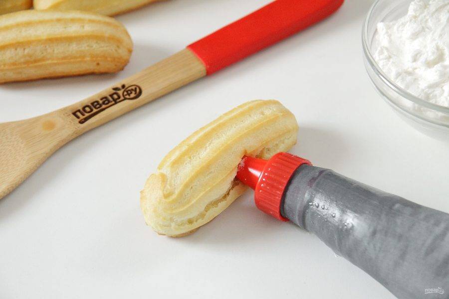 8. Выпекайте в разогретой до 180 градусов духовке около 30 минут. Эклеры должны хорошо подняться и приобрести слегка золотистый оттенок. Готовые эклеры остудите на решетке.