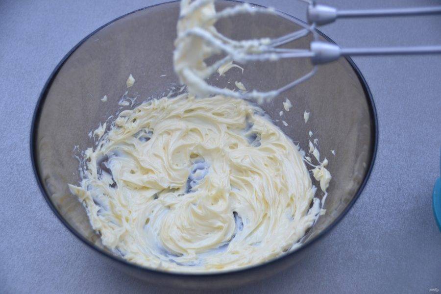 Мягкое сливочное масло взбейте до побеления и пышности.