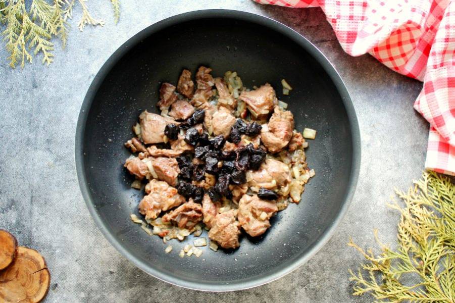 Убавьте огонь до среднего. Чернослив разрежьте пополам и добавьте к мясу.