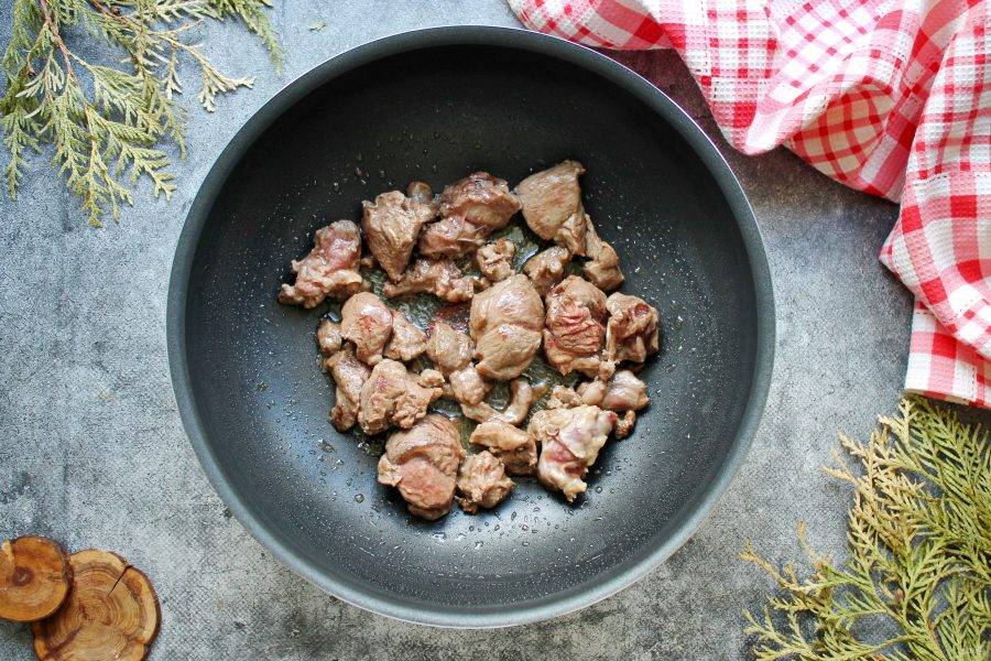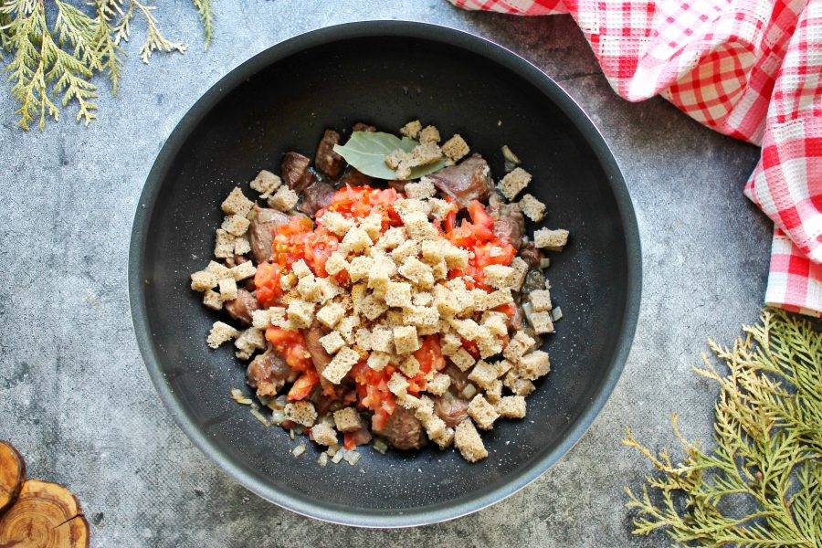 У ржаного хлеба срежьте корки, порежьте мелким кубиком и выложите к мясу.