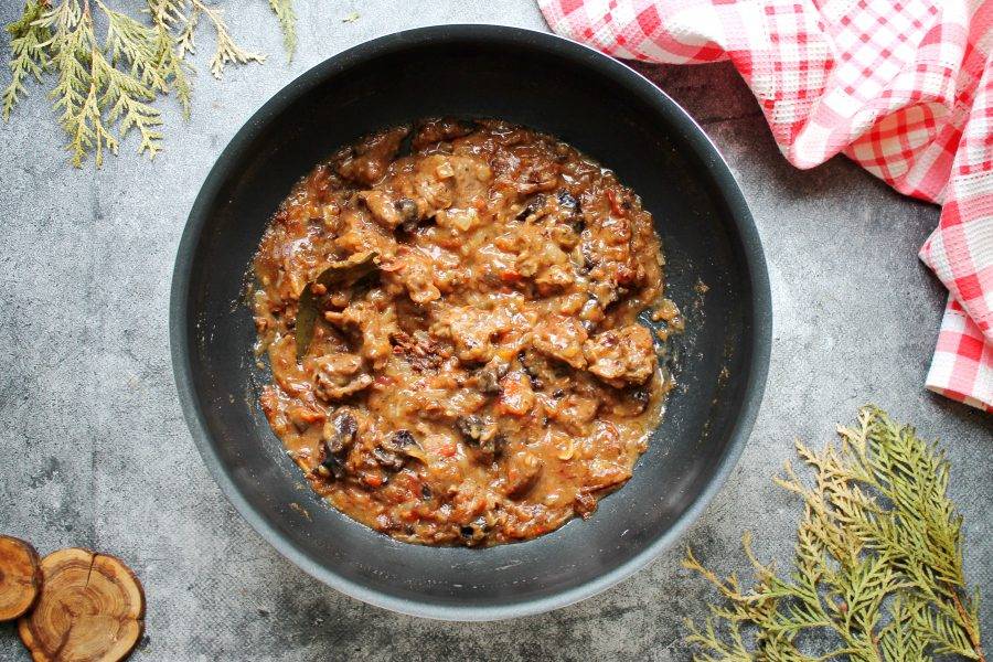 Закройте казан крышкой, убавьте огонь до минимального и готовьте в течение одного часа, следя, чтобы не пригорело.